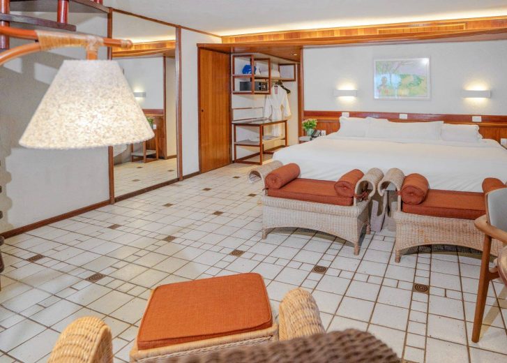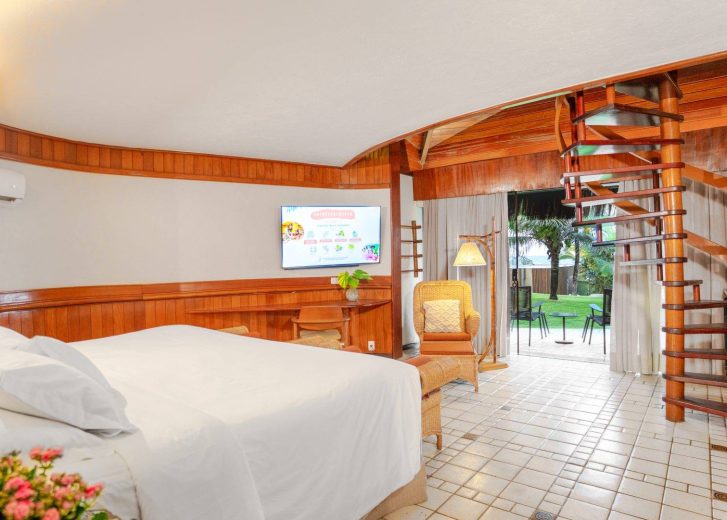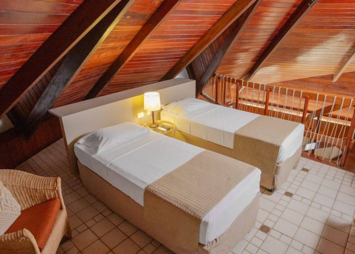 Localizados em uma área acolhedora do Resort, os Bangalôs unem charme rústico, elegância e amplitude em 75 m² distribuídos em dois pavimentos. No térreo, um quarto com cama king size convida ao descanso. No mezanino, duas camas de solteiro (0,90 x 2,00 m) criam o cenário ideal para receber a família com conforto, em um ambiente onde cada detalhe foi pensado para acolher com leveza e bem-estar.
