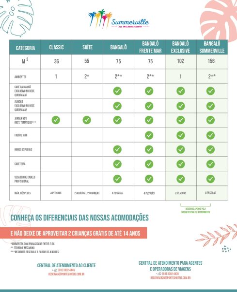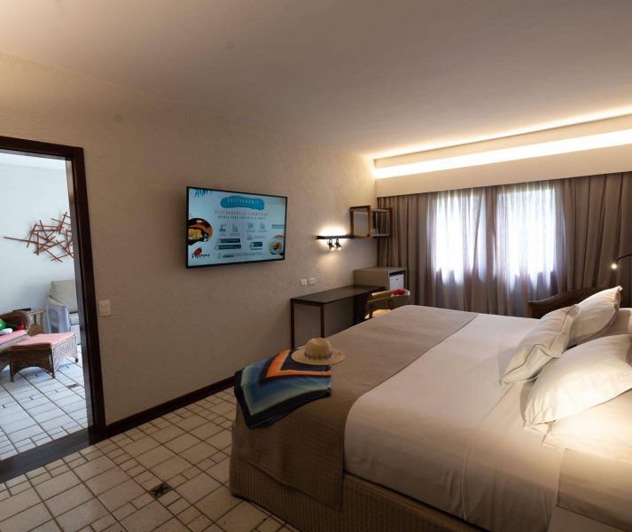 Nossa Suíte é perfeita para famílias. Tem um ambiente espaçoso, possui quarto exclusivo para o casal e todo o conforto para as crianças. A Suíte é uma das acomodações mais bem equipadas do Summerville, com 55 m² e capacidade para comportar 2 adultos e 2 crianças (de até 14 anos) ou 1 adulto e 2 crianças. A unidade também pode ser conjugada à outra acomodação Classic. Conta com sala de estar e dispõe de uma porta independente para banheiro e sala. O quarto também é equipado com sofá cama e uma copa. Na varanda, a família pode optar por descansar ao final do dia observando a paisagem do nosso lindo jardim ou da nossa piscina de 1200m².