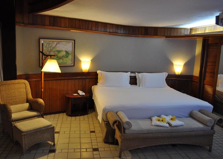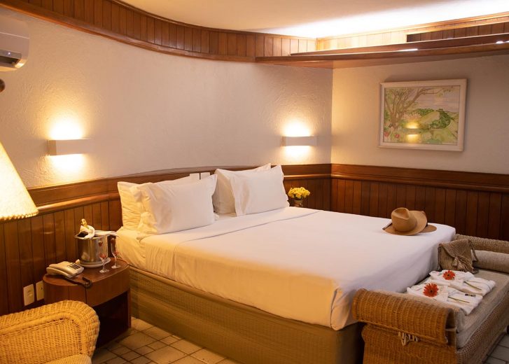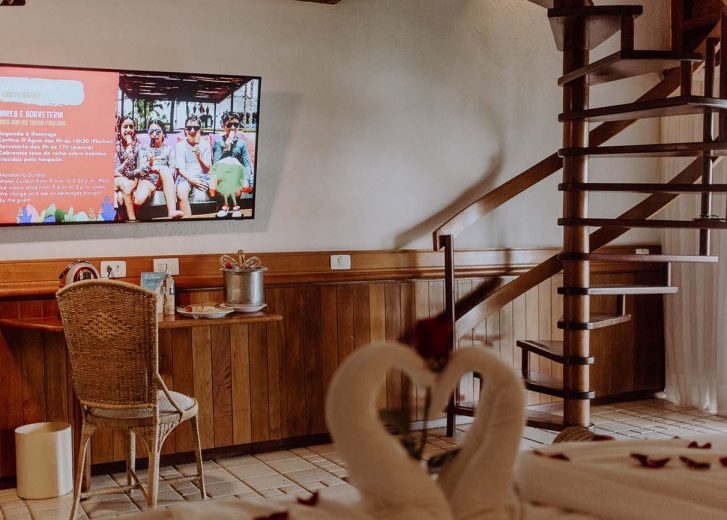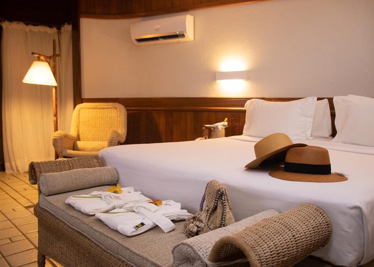 With a unique structure, reserved, rustic decoration, in addition to a large space of 75 m², which has two floors: a first floor bedroom and a living room on the mezzanine. Its interior is equipped with two single beds (0.90 x 2.00 m), chaise armchair, 55″ HDTV (double TV with Chromecast), coffee maker, pampering and L’occitane amenities. Close to the sea, it has access to the beautiful view of the garden of our resort.